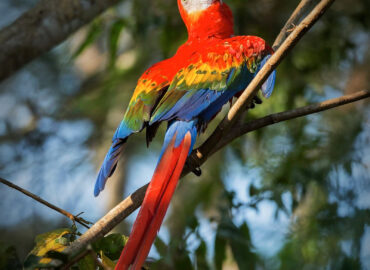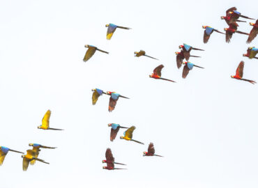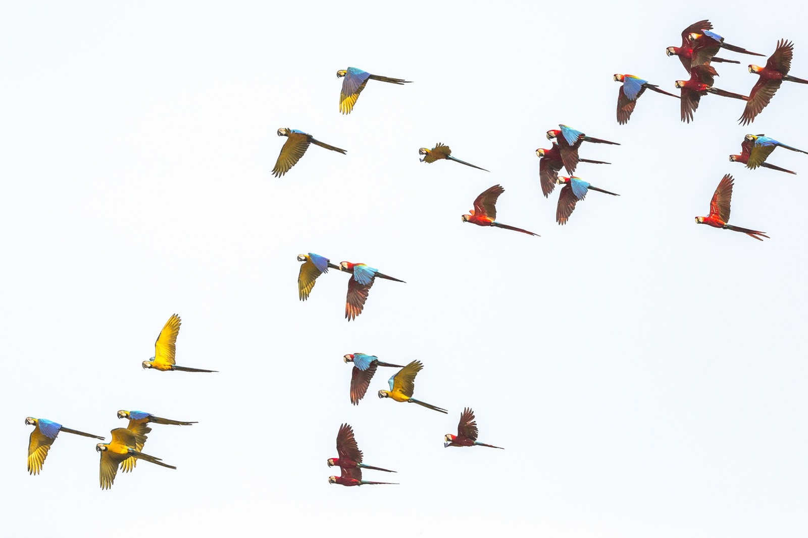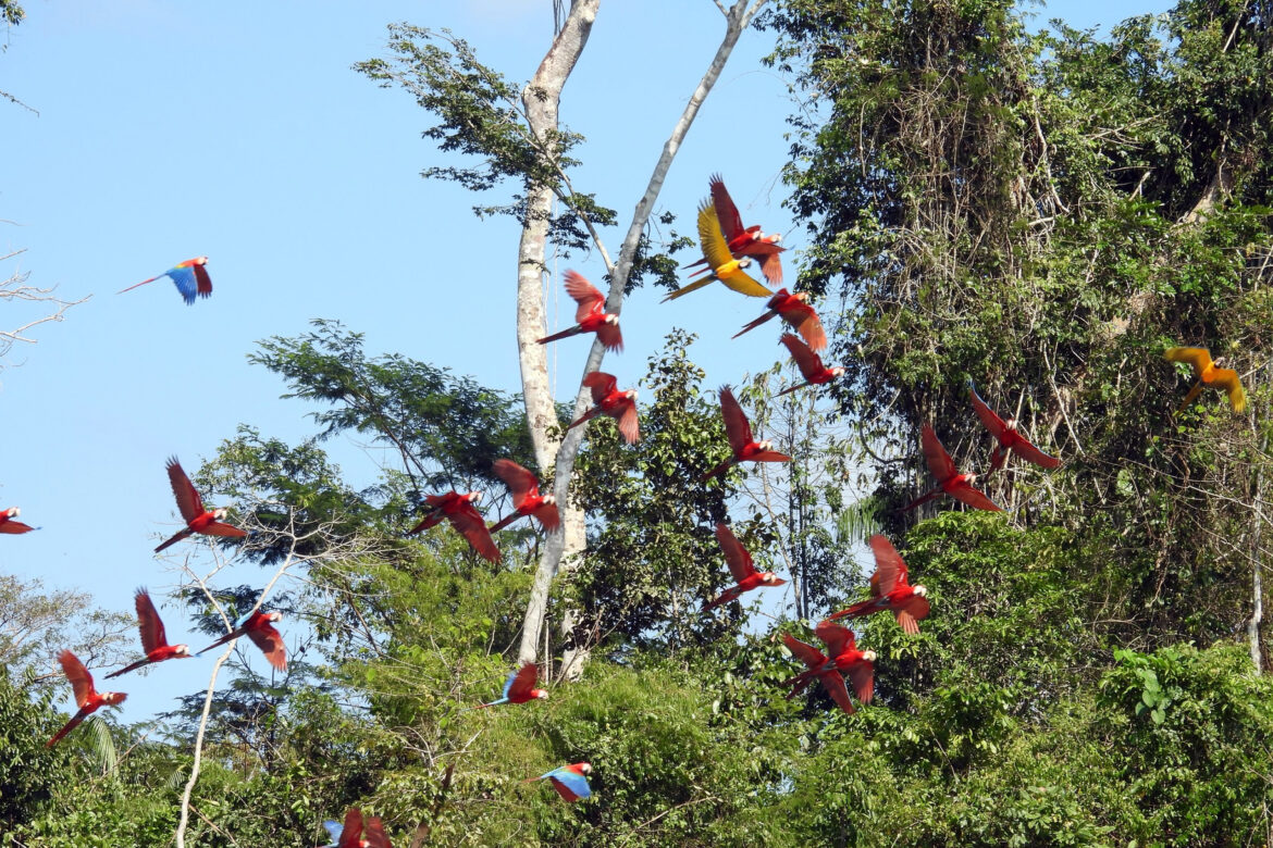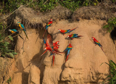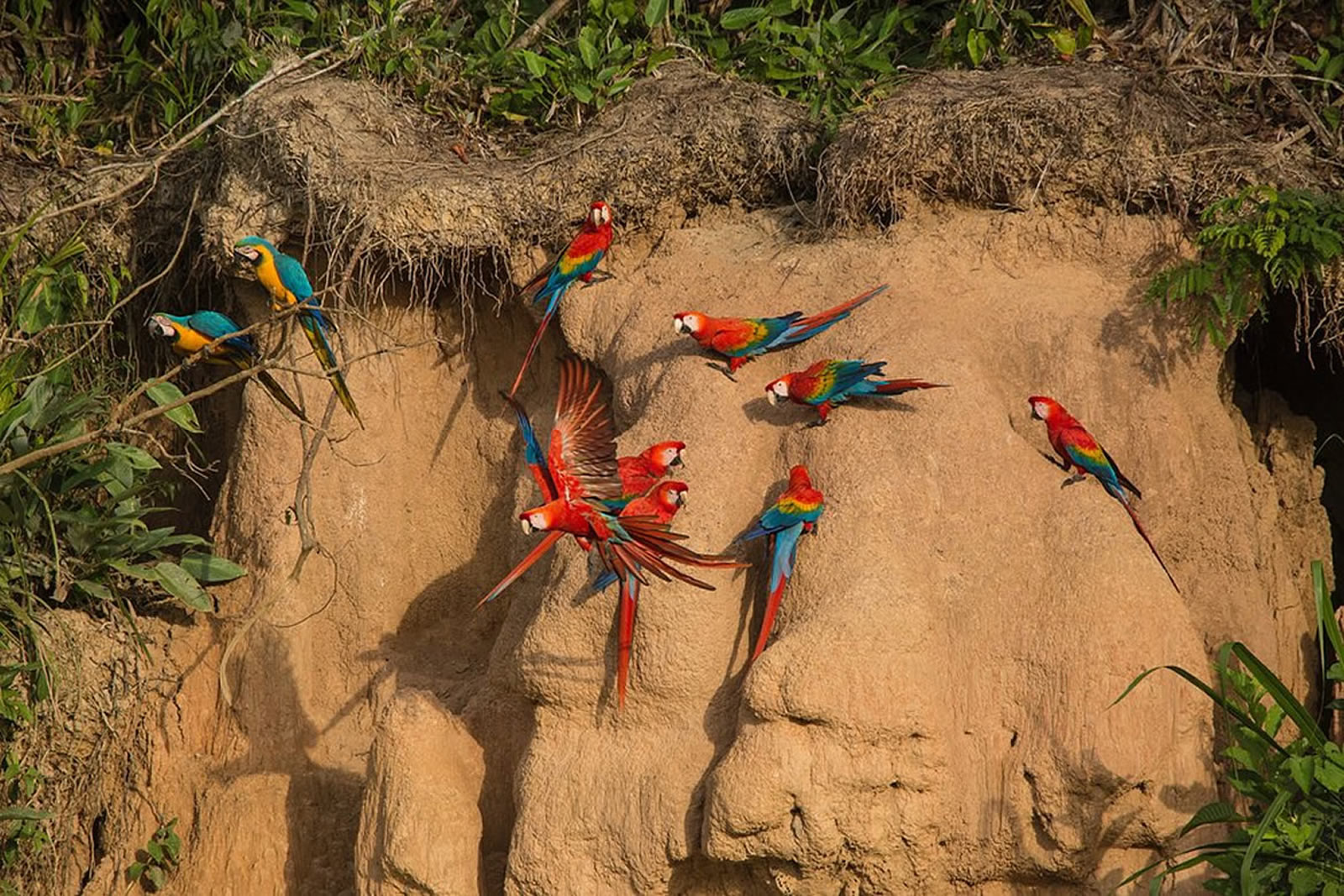 Una vez llegada a la collpa de guacamayos veremos cientos de loros de diferentes especies que vienen a comer arcilla de la pared adyacente al rio. Nosotros nos acomodaremos en nuestras silletas para esperar que comience uno de los espectáculos naturales más hermosos de avifauna del mundo. A los loros les siguen las 3 especies de guacamayos más coloridos de América, se juntan para comer arcilla necesaria en su dieta diaria y eliminar toxinas. En un buen día de actividad podrá ver cientos de estos maravillosos animales volando sobre usted. Una experiencia para toda la vida.